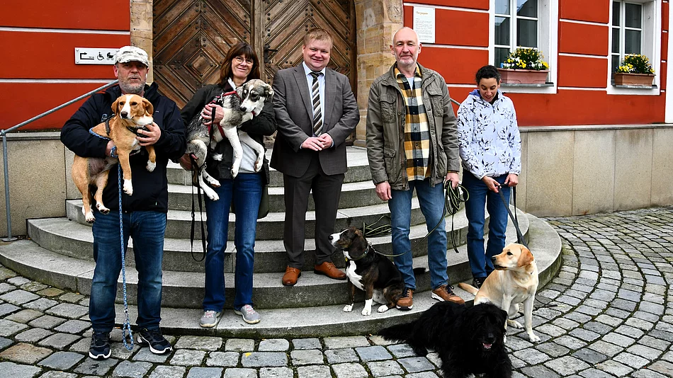 Gruppentreffen von Zwei- und Vierbeinern: Anlässlich der Neueröffnung von Stefanie Riemers „HundeschuleN-Städtedreieck“ trafen sich Bürgermeister Thomas Gesche, Geschäftsinhaberin Stefanie Riemer und jede Menge kleine und große Hunde mit ihren Besitzern zum Ortstermin am Rathaus, um sich über die Leidenschaft für Tiere und deren optimale Erziehung auszutauschen.