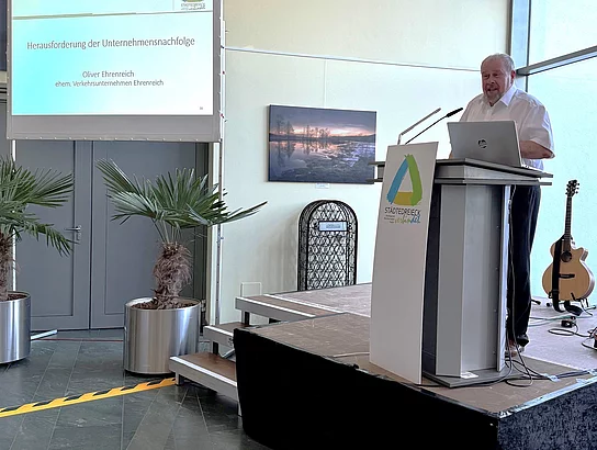 Besonders eindrucksvoll schilderte der geladene Gastredner Oliver Ehrenreich (ehemals Geschäftsführer Verkehrsunternehmen Ehrenreich) die Übergabe seines Unternehmens, die im vergangenen Jahr erfolgreich vollzogen wurde. Neben der frühzeitigen organisatorischen Übergabe seien auch die eigenen Emotionen ein großer Faktor. Der Nachfolger sollte genug Zeit und Möglichkeiten haben, sich in das Unternehmen einzuarbeiten und auch das Team „abzuholen und mitzunehmen“. Im Falle Ehrenreichs ein leichtes Spiel, da Christoph Riedl (jetziger Geschäftsführer der neu benannten 1234 Taxi und Omnibus GmbH) bereits langjähriger Mitarbeiter in seinem Unternehmen war. Die Vertrauensbasis war somit bereits gegeben und Oliver Ehrenreich konnte den Betrieb guten Gewissens übergeben.
