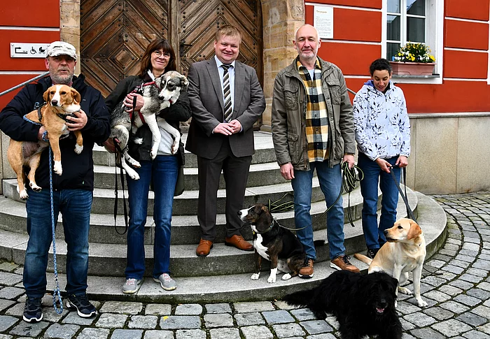 Gruppentreffen von Zwei- und Vierbeinern: Anlässlich der Neueröffnung von Stefanie Riemers „HundeschuleN-Städtedreieck“ trafen sich Bürgermeister Thomas Gesche, Geschäftsinhaberin Stefanie Riemer und jede Menge kleine und große Hunde mit ihren Besitzern zum Ortstermin am Rathaus, um sich über die Leidenschaft für Tiere und deren optimale Erziehung auszutauschen.